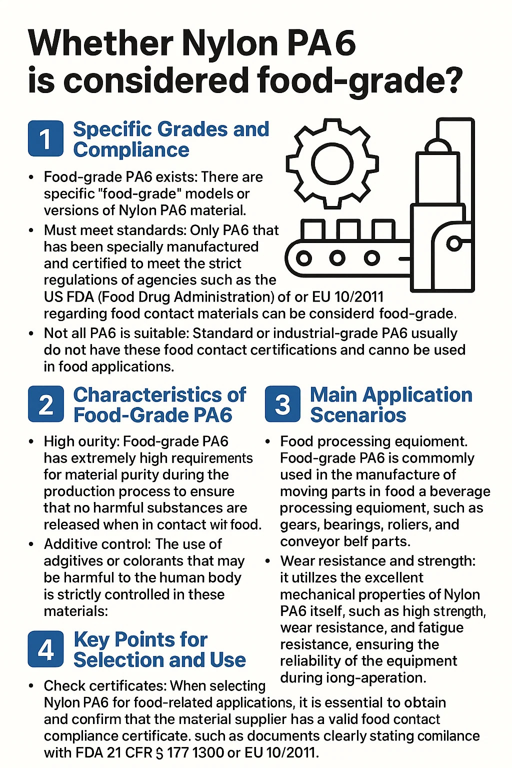 Не весь PA6 подходит: стандартный или промышленный PA6 обычно не имеет сертификатов о контакте с пищевыми продуктами и не может использоваться в пищевой промышленности.