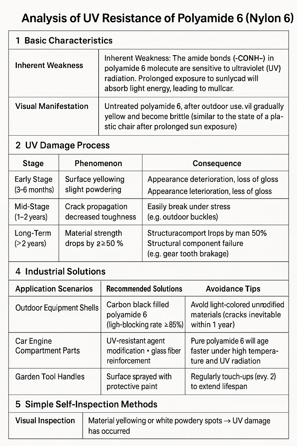 Присущая слабость: амидные связи (-CONH-) в молекуле полиамида 6 чувствительны к ультрафиолетовому (УФ) излучению. Длительное воздействие солнечного света поглощает световую энергию, что приводит к разрыву молекулярной цепи.