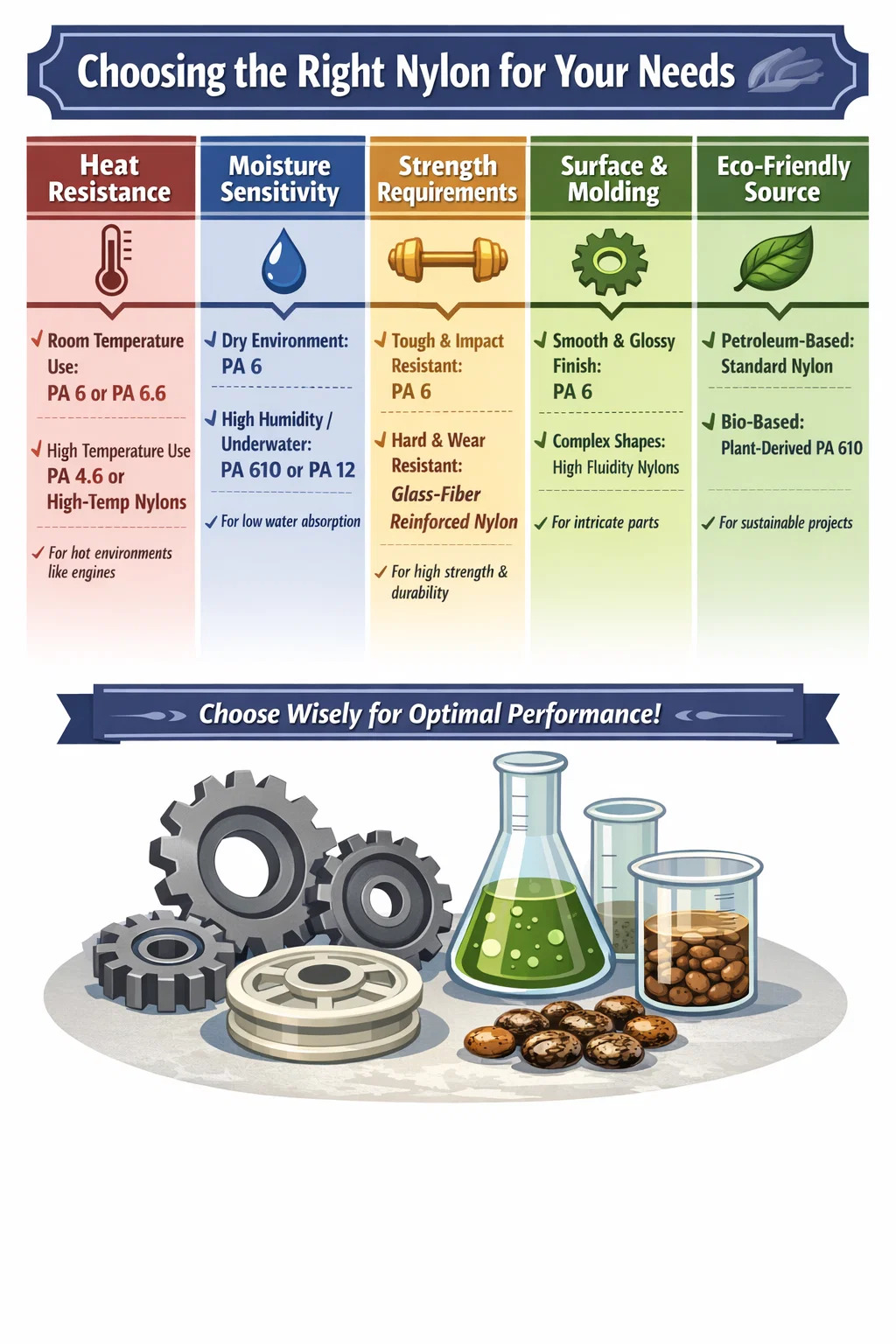Учитывая большое разнообразие нейлоновых материалов на рынке, выбор правильного «типа» так же важен, как выбор правильного размера и материала при покупке одежды. Семейство полиамидов состоит из множества представителей, каждый из которых имеет свои особенности. Чтобы выбрать наиболее подходящий, можно учитывать следующие практические аспекты: