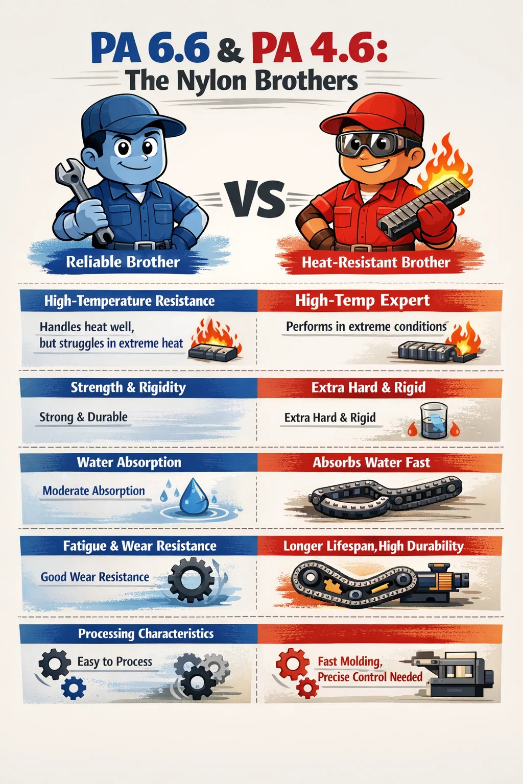 В семействе нейлонов PA 6.6 и PA 4.6 похожи на двух братьев, похожих внешне, но с разными характерами и способностями. Оба относятся к семейству полиамидов, но ведут себя совершенно по-разному при высоких температурах и нагрузках.